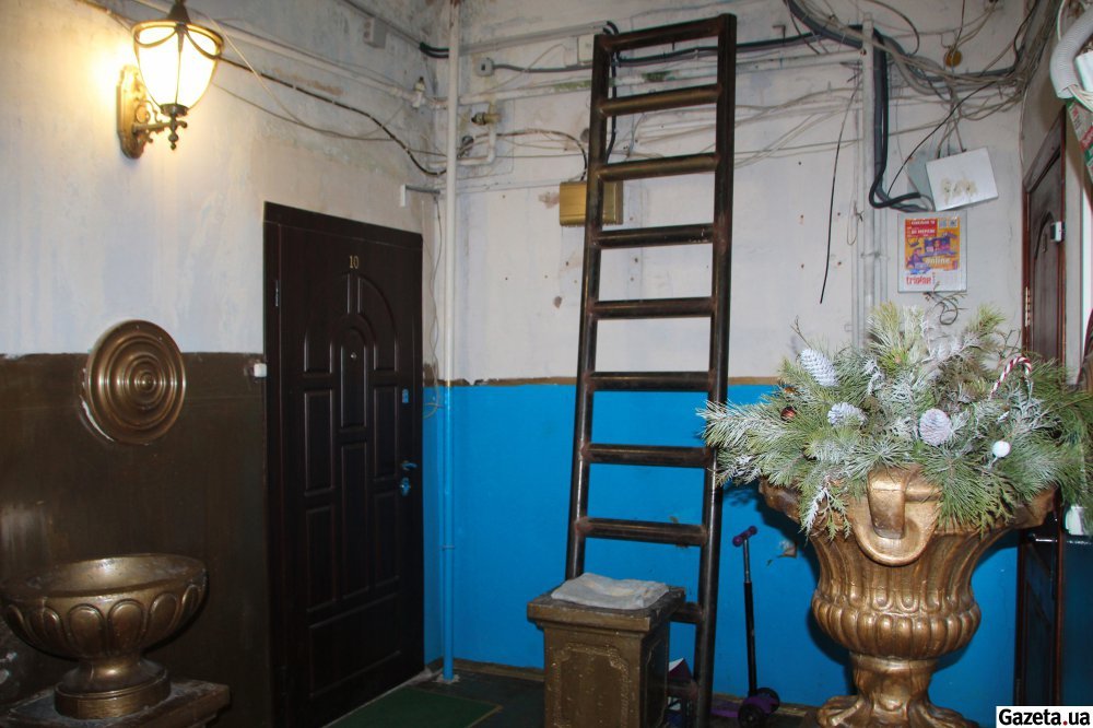 Старі двері, яким понад пів століття, набули нового життя. Окрім золотого кольору мають дзеркальні вставки з вензелями. За ними починається сходовий майданчик і чекає сюрприз — величезне настінне дзеркало в масивній рамі. Як виявиться пізніше, маскує двері в комірчину.
