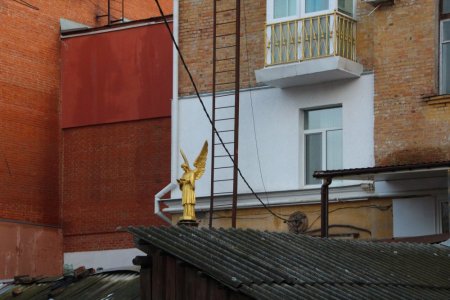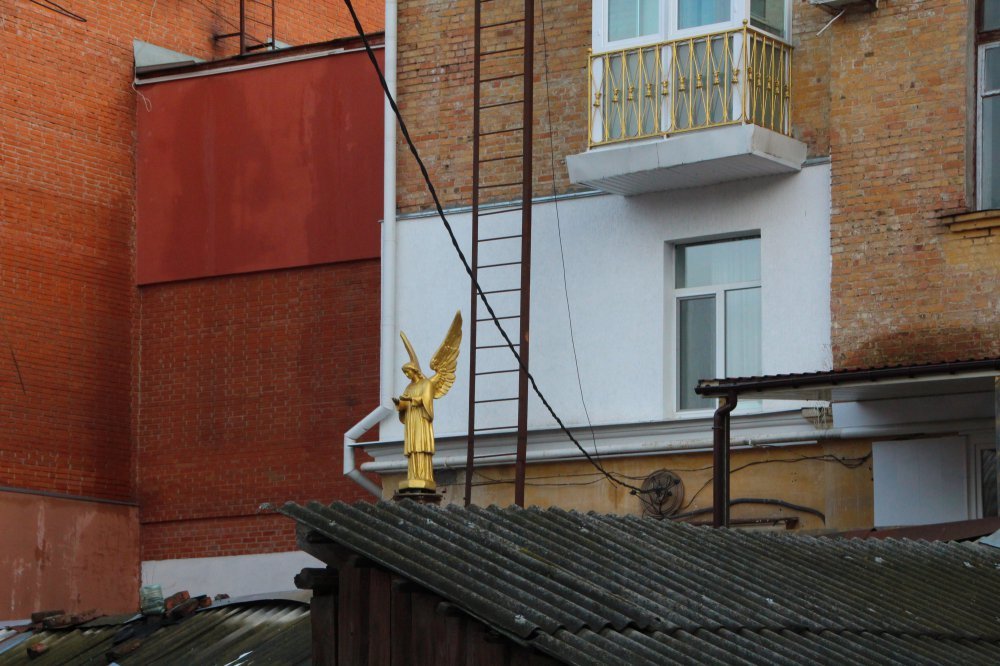 Звертаю увагу, що зі стіни на рівні першого поверху під вікнами магазину великими плямами обвалився тиньк, оголивши стару цеглу. Світло-коричнева фарба на металевій колоні, увінчаній янголом, місцями полущилася, з-під неї починає проступати іржа.