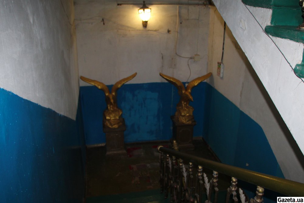 Поштові скриньки теж незвичні. Окрім бронзової фарби виявляються дерев'яними. Дверей на першому поверсі немає. З-під побілки проступають контури цегляного муру. Натомість хижим поглядом і розкритими крилами зустрічають гостей два бетонних позолочених римських орли. За винятком "золотого декору" під'їзд доволі звичайний: синя олійна фарба вкриває стіни до половини, згори — стара крейдова побілка, потріскана від часу. Жмути дротів під стелею. Штучний камінь сходів і плитка майданчиків зафарбовані олійною фарбою — місцями вже стертою.