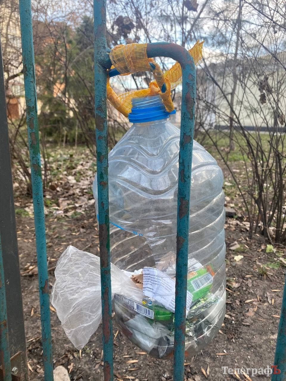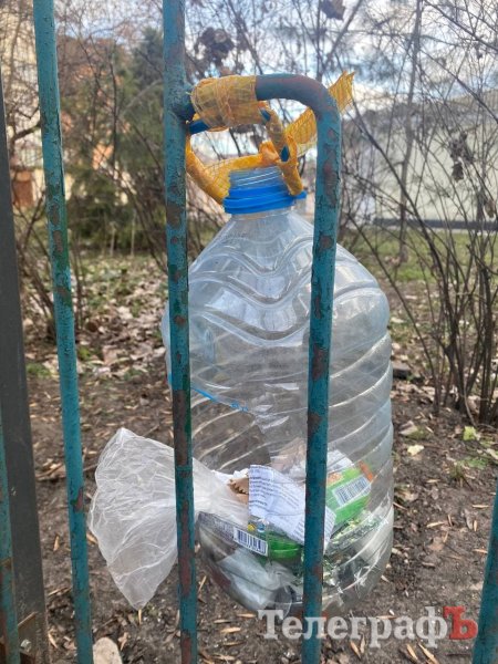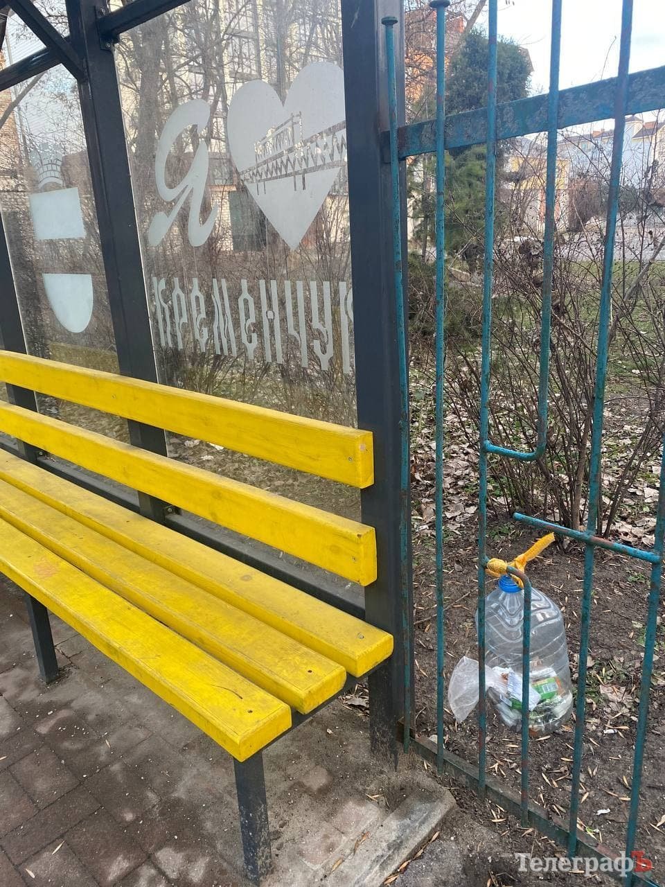 На зупинці «Льотний коледж» кременчужани помітили оригінальний смітник: пластикову баклажку просто примотали до огорожі скотчем.