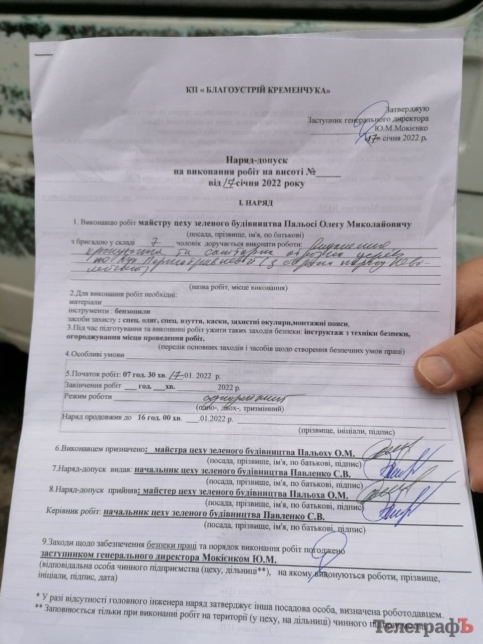 Майстер КП «Благоустрій Кременчука» показав наряд на знесення 9 дерев. Акт обстеження зелених насаджень не показав. За словами майстра, йде санітарна вирубка аварійних дерев. І навесні тут планується висадити алею сакур.