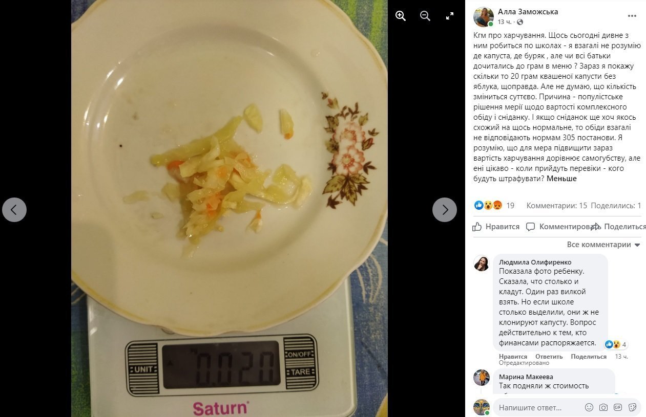 У соціальних мережах та батьківських чатах з’являються пости про те, що їжа зовсім не смакує учням. І дійсно, те, що бачимо на фотографіях, мало схоже на меню від Клопотенка.