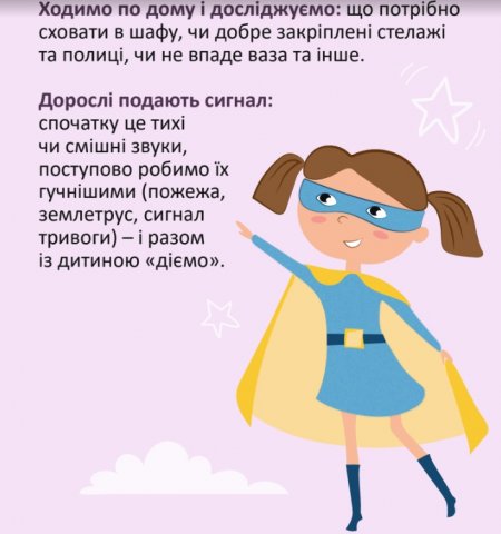Далі треба легітимізувати страх дитини і сказати: «Мені іноді буває страшно, коли я бачу в мультфільмах і кіно пожежу або коли думаю про землетрус. Тобто, коли я думаю про те, що щось може нам загрожувати.