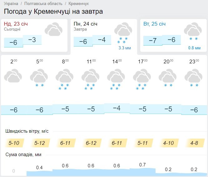 Вранці та вдень 24 січня Кременчук замете снігом – синоптики обіцяють хуртовини. За повідомленням Полтавського обласного центру з гідрометеорології, протягом доби по Полтавській області очікуються пориви північно-східного вітру 15-20 м/с (1 рівень небезпечності – жовтий).