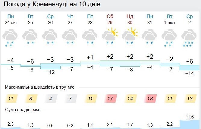 Зима прийшла у Кременчук надовго: протягом тижня нічна температура повітря коливатиметься від -4 до -12°C, а вдень здебільшого становитиме від -3 до -6°C. За даними Gismeteo, невеличке потепління варто чекати лише в п’ятницю та на вихідні.