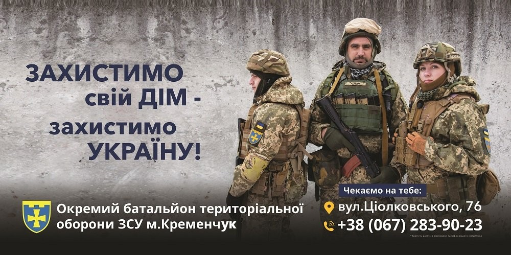 Триває набір в окремий батальйон територіальної оборони ЗСУ Кременчук. Кременчужани можуть долучитися до 145 батальйону територіальної оборони (військова частина А7311), яка розташована у колишньому приміщенні наркодиспансеру.