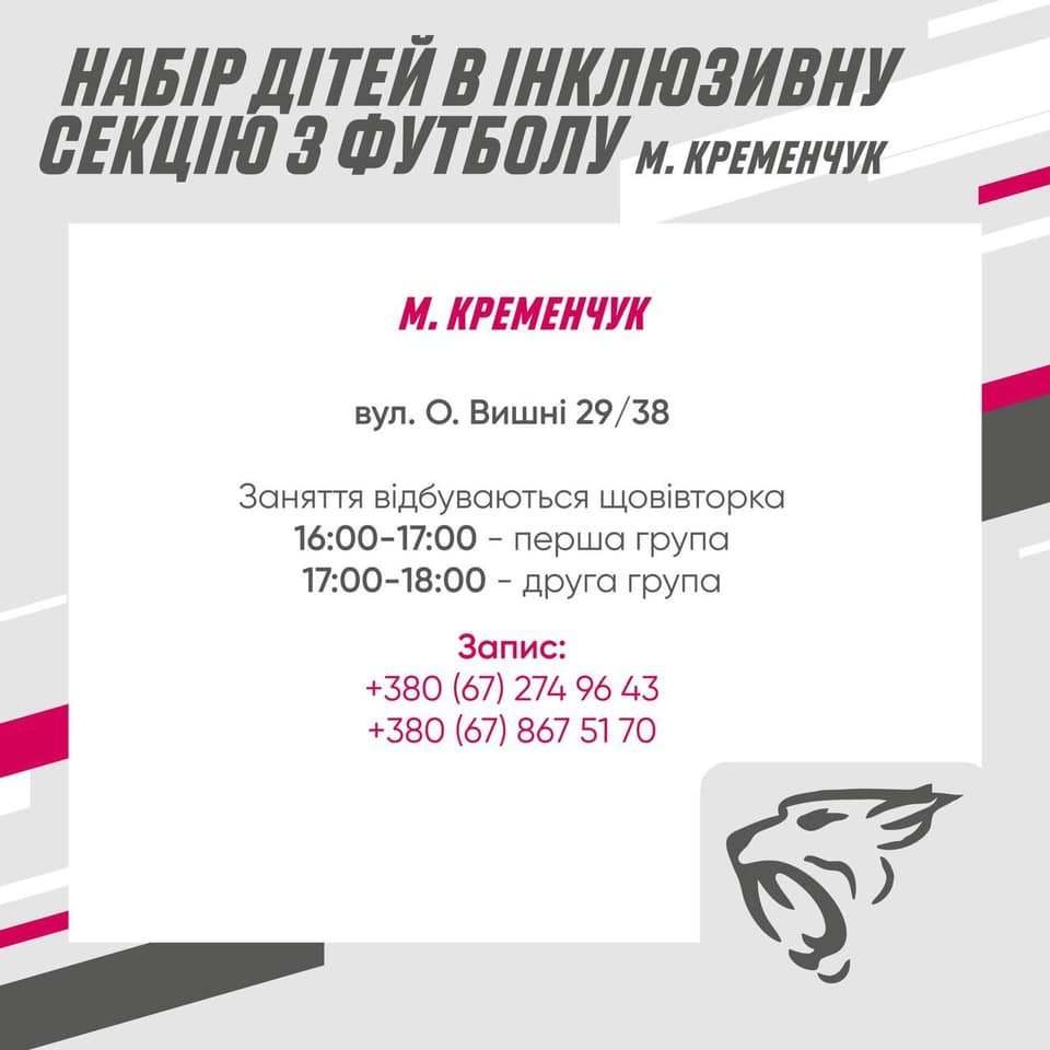 У Кременчуці відкрили інклюзивну секцію з футболу, де викладатимуть тренери з футбольної академії «Ягуар». Безкоштовні спортивні тренування для груп від 6 до 16 років. Заняття відбуваються щовівторка з 16.00 до 17.00 – перша група, з 17.00 до 18.00 – друга група.