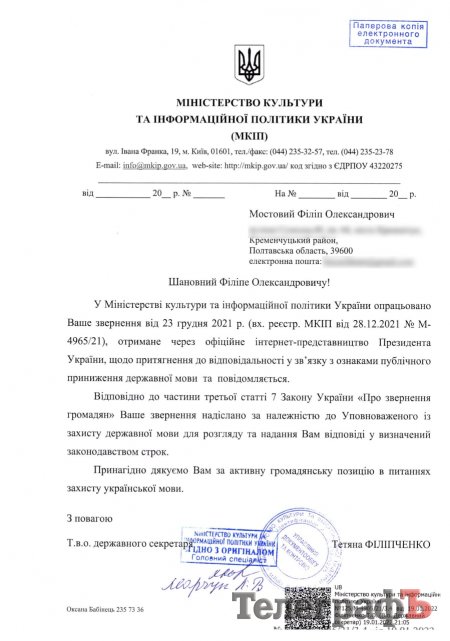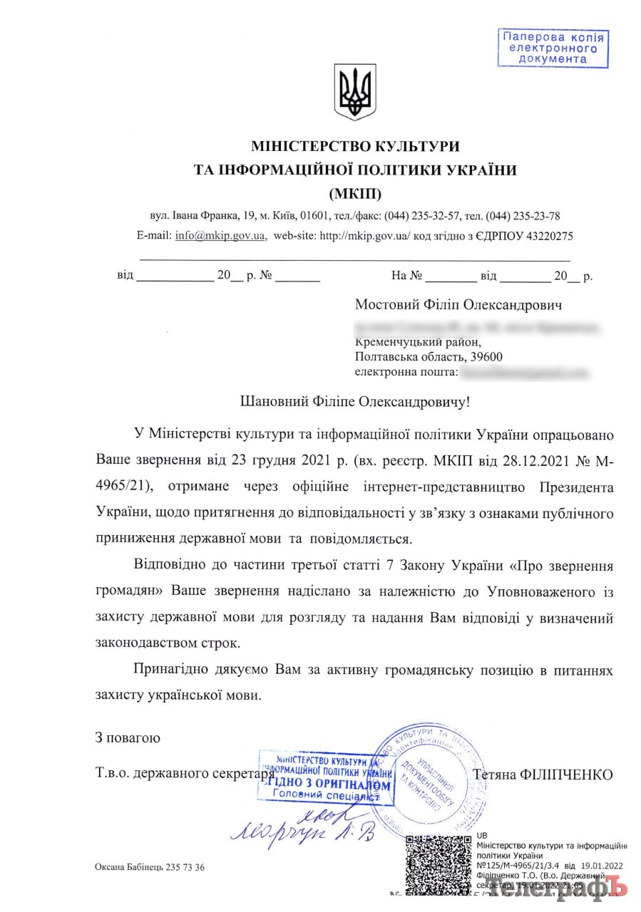 Отже, я звернувся з таким зверненням, детально описав ситуацію і надав посилання на порушення. Приблизно через 2 тижні мені на електронну пошту прислали такий лист: