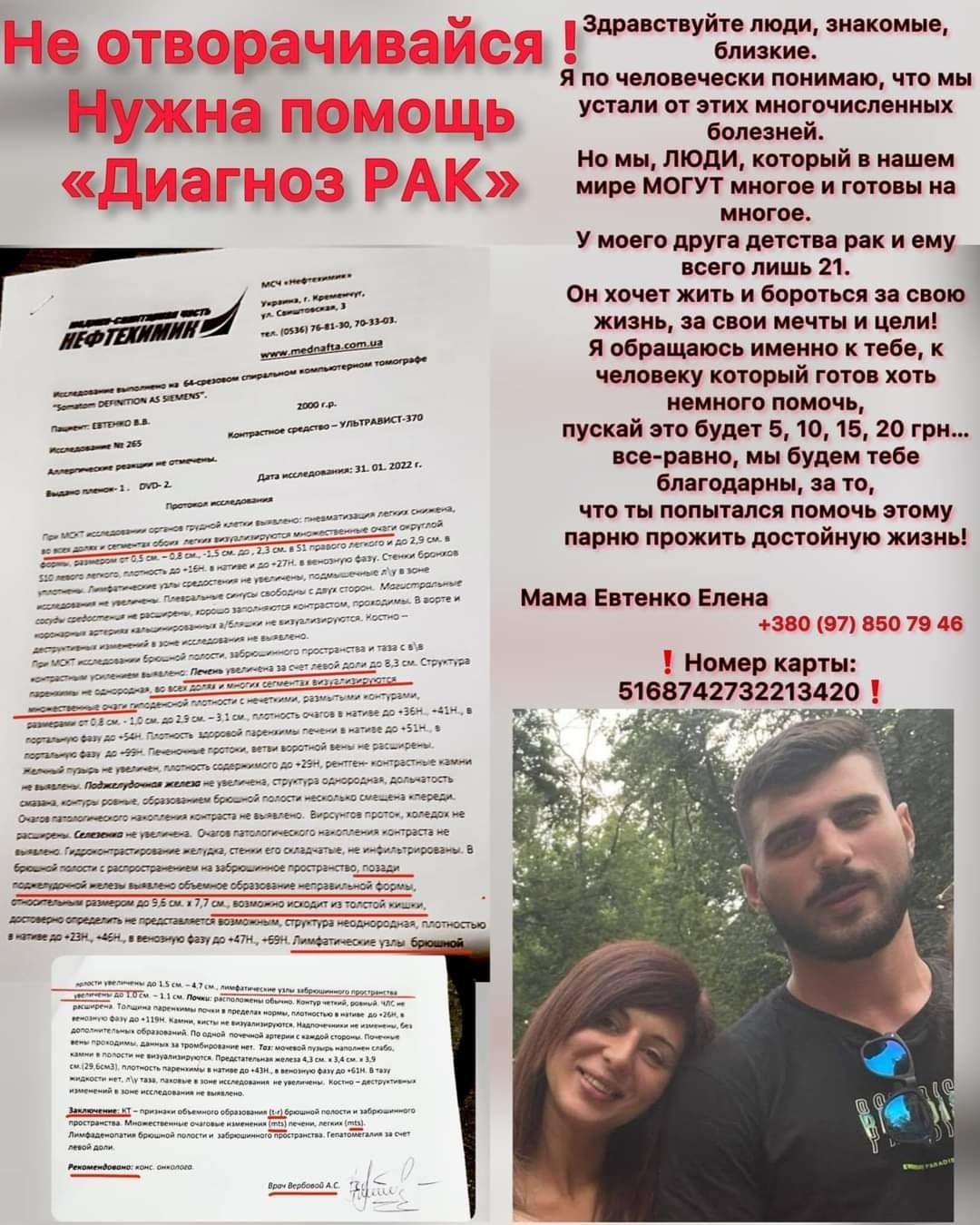 Картка ПриватБанку 5168 7427 3221 3420 (мама Олена Євтенко)