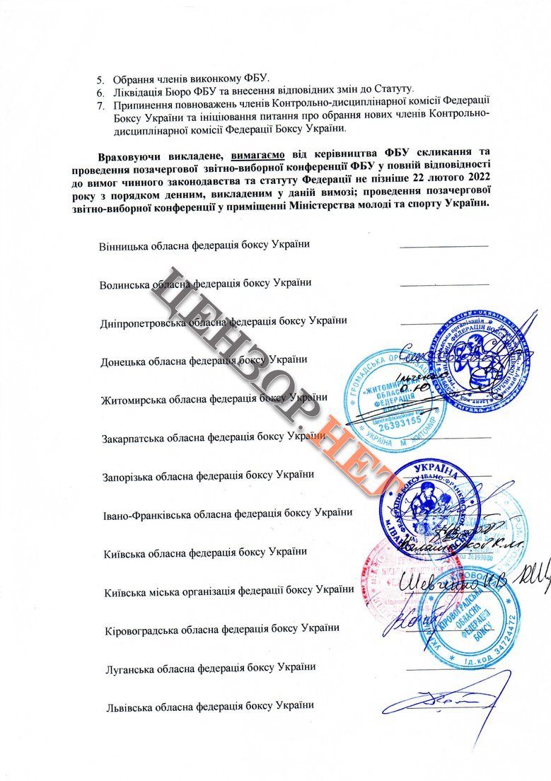 До Харківської, Київської, Полтавської, Хмельницької, Кіровоградської обласних та Київської міської федерацій боксу застосовано дисциплінарну санкцію у вигляді тимчасового припинення членства у Федерації боксу України строком на 2 місяці з позбавленням права виконувати функції колективного члена (місцевого осередку) ФБУ строком на 2 місяці.