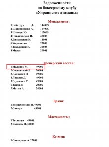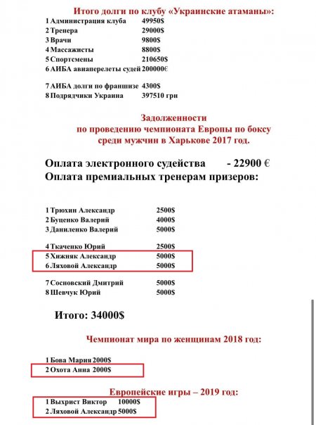 Кременчуцькі боксери та тренери недоотримали 1,5 мільйона гривень (якщо рахувати за курсом долара по 30). Борги перед «Українськими отаманами» та їх тренерами із Кременчука сягають $51 200. Кошти недоотримали боксери: Віктор Вихрист, Денис Пояцика, Дмитро Грінченко, а також тренер Михайло Мельник. Федерація заборгувала кошти тренеру Олександру Ляховому та боксеру Віктору Вихристу за чемпіонат Європи 2017 року та Європейські ігри 2019 року.