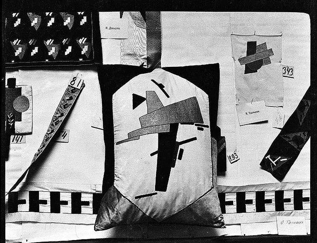 Цікаво, що йшлося не лише про вишивку. Зокрема, як зазначено в «Короткій історії вишивки авангарду», 1915 року виготовлені роботи були представлені в московській галереї Лемерсьє («Виставка сучасного декоративного мистецтва. Вишивки та килими за ескізами художників»). І як повідомляє газета «Русское слово»: «Яскраве сонце України заграло в Галереї Лемерсьє... Ці подушки, скатертини, шарфи, халати, ширми, килими, набійки створювалися в майстернях руками простих жінок під керівництвом їхніх інтелігентних керівників». До слова, на цій виставці було представлено й три супрематичні ескізи К. Малевича для подушки і двох шарфів. Також збереглася світлина американського публіциста Олівера Сейлера, на якій зафіксовано подушку з вишитою шовком супрематичною композицією (і, як вважають видатні вчені, вишивка була створена саме за ескізом Малевича). Також віднайдено каталог цієї виставки, що є ще одним свідченням співпраці відомих художників і народних майстрів.