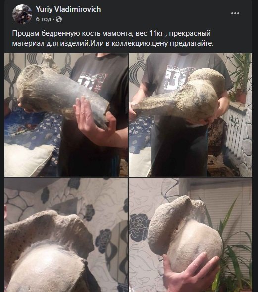– Продам бедренную кость мамонта, вес 11 кг, прекрасный материал для изделий. Или в коллекцию. Цену предлагайте, – йдеться у повідомленні.