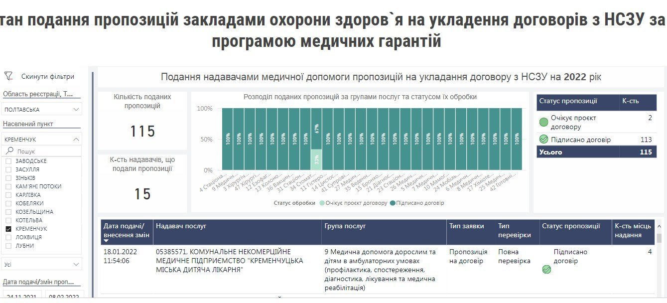 Станом на 13 лютого 15 надавачів медичних послуг у місті уклало 113 договорів на медичне обслуговування населення з Національною службою здоров’я. Прослідкувати стан укладання договорів можна на дашборді НСЗУ.
