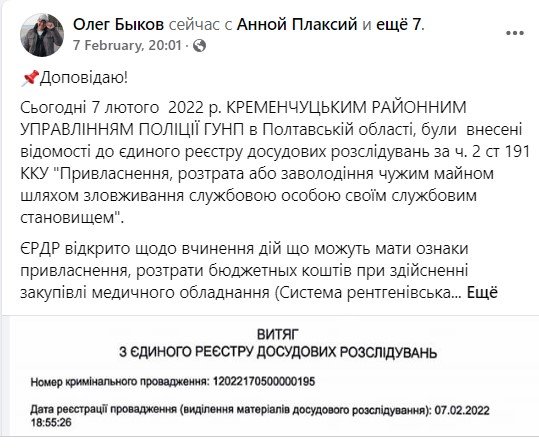 А сьомого лютого громадський активіст Олег Биков на своїй сторінці у фейсбуці розмістив витяг з Єдиного реєстру досудових розслідувань. Поліція відкрила кримінальне провадження за ч. 2 ст. 191 Кримінального кодексу України (Привласнення, розтрата або заволодіння чужим майном шляхом зловживання службовою особою своїм службовим становищем). Йдеться якраз про закупівлю рентгенапарату для пологового будинку. Олег Биков подав заяву в правоохоронні органи, бо підозрює завищення ціни. Зокрема він вказує на ряд закупівель у Prozorro цієї ж моделі рентгенапарату DIG-1100 за значно нижчими цінами. Різниця складає понад мільйон.