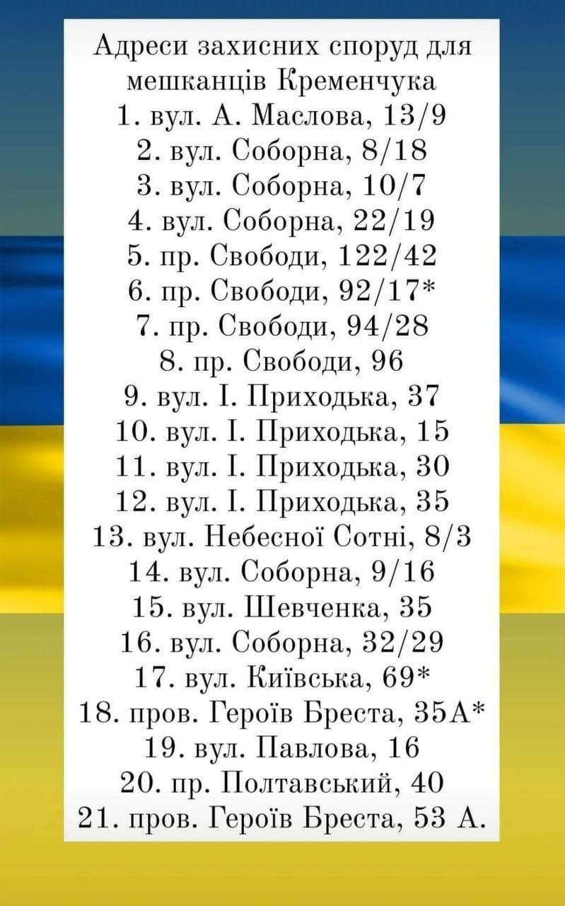 Список укриттів у Кременчуці. Сховища та протирадіаційні укриття призначені для укриття для тих підприємств, які мають завдання на особливий період та забезпечують роботу основних систем життєзабезпечення Кременчука. Укриття інших категорій населення заплановано у підвальних, напівпідвальних та інших заглиблених приміщеннях, які є на території міста. Для цього ви повинні завчасно перевірити підвали та знати, у кого з сусідів знаходяться ключі від підвального приміщення.