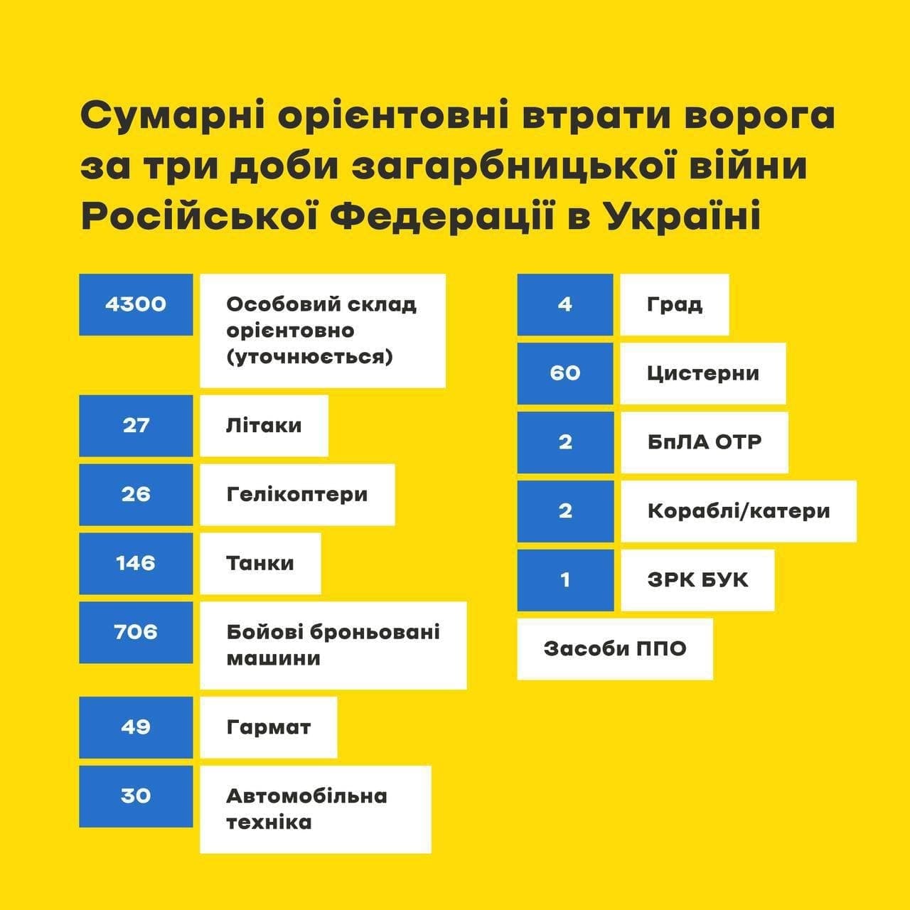 Сумарні орієнтовні втрати ворога за три попередні доби загарбницької війни Російської Федерації в Україні: