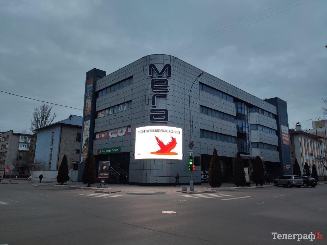 27 лютого Т помітив на екрані торговельного центру «Мега» напис «Русский военный корабль, иди нах*й». Подібні зображення з’являються по всьому місту.