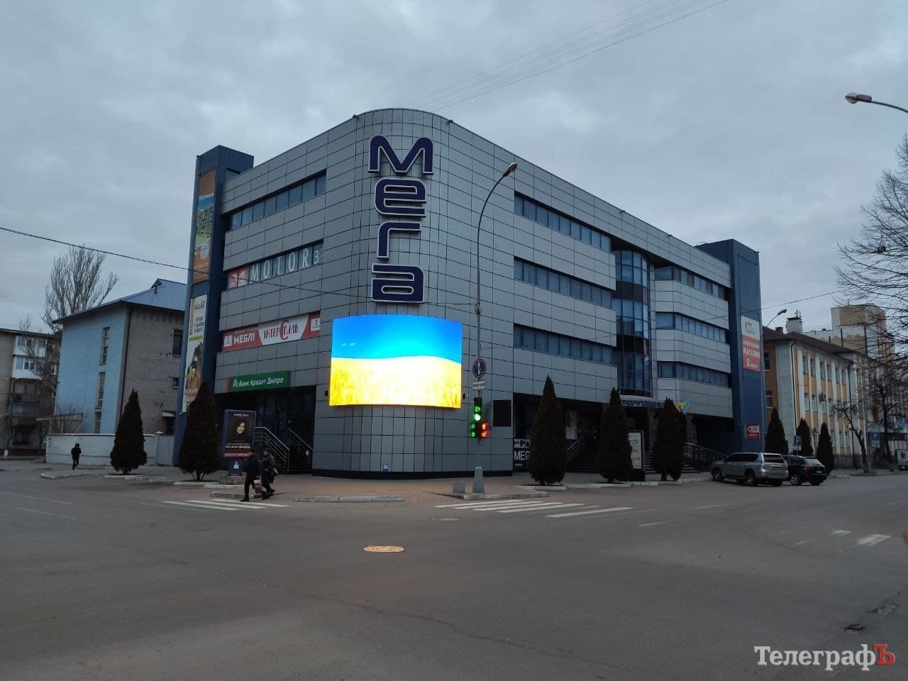 На будівлі «Мега» напис змінювався на зображення українського прапора.