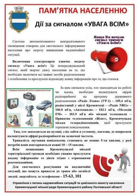 - Покинути сховище можна лише при команді «відбій». Сирени при цьому не включають. Населення повідомляють через канали місцевого мовлення, оперативний черговий дає інформацію на радіо і телебачення. І її транслюють. З’явиться повідомлення про це й у телеграм (СИРЕНА Кременчук).