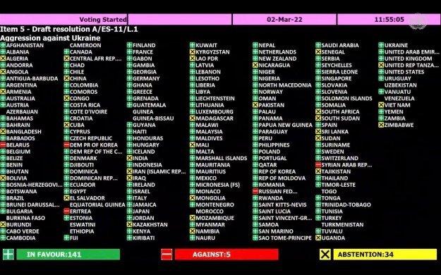 За цю резолюцію проголосувала 141 країна, лише 5 були проти та 35 утрималися. Проти документа проголосували сама Росія та її найвідданіші сателіти: Білорусь, яка безпосередньо залучена до збройного вторгнення, Сирія, Еритрея та держава-ізгой КНДР.