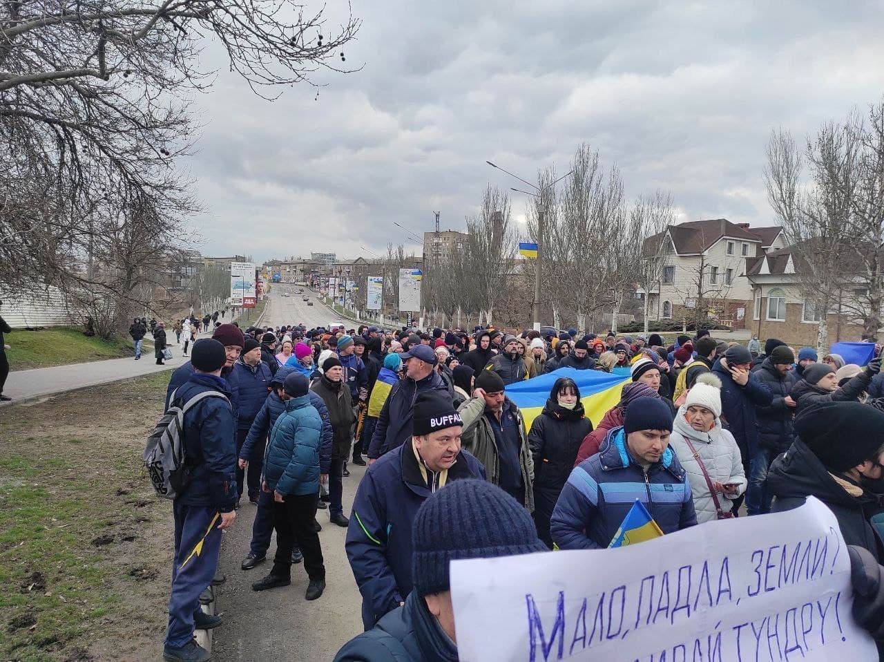 Мелітопольці о 12:00 зібралися на площі Перемоги, попри заборону російських окупантів. Учасники мітингу пройшлися проспектом з державними прапорами. Місцеві жителі співали патріотичні пісні та скандували заклики до ворога: «Окупанти, додому», «Слава Україні», «Мелітополь – Україна», «Путін х*йло», «Мелітополь вставай», «Слава Україні! Героям Слава!».