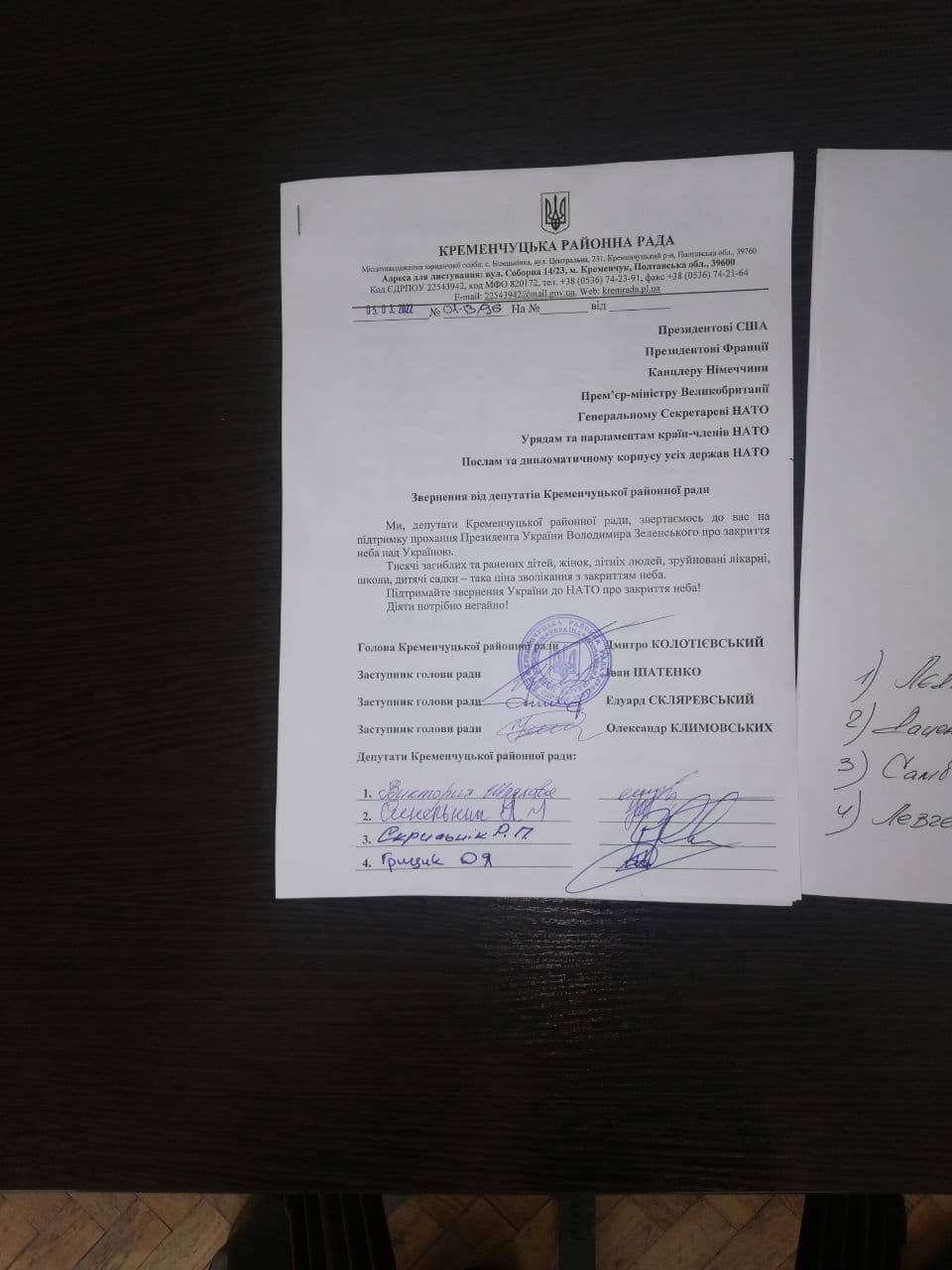 На ранковому брифінгу начальник Кременчуцької районної військової адміністрації Олег Лєднік повідомив, що 5 березня в усіх 12 територіальних громадах району розпочався збір підписів на підтримку заяви Президента України Володимира Зеленського до лідерів Заходу щодо закриття неба над Україною. Голова районної ради Дмитро Колотієвський повідомив, що вчора на підтримку цього звернення підписались більшість депутатів райради.