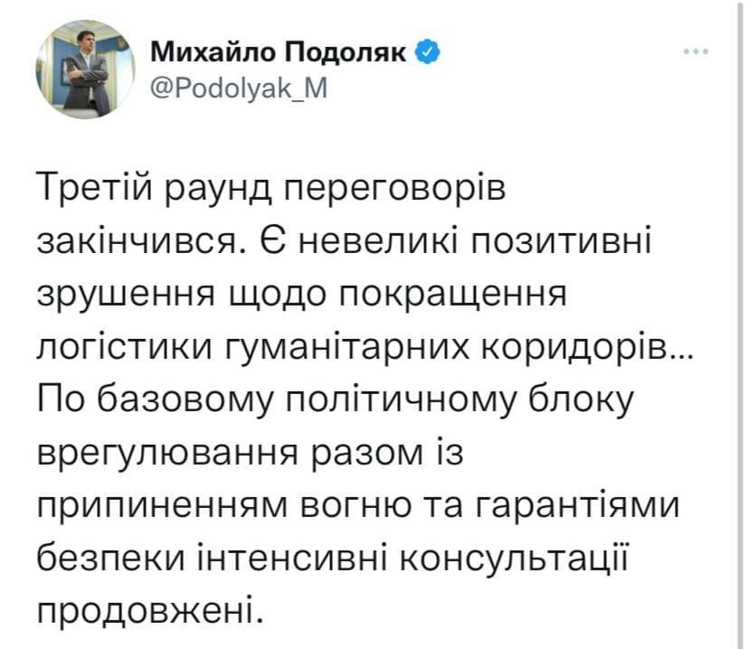 – Третій раунд переговорів закінчився. Є невеликі позитивні зрушення щодо покращення логістики гуманітарних коридорів… По базовому політичному блоку врегулювання разом із припиненням вогню та гарантіями безпеки інтенсивні консультації продовжені., – зауважив Михайло Подоляк.
