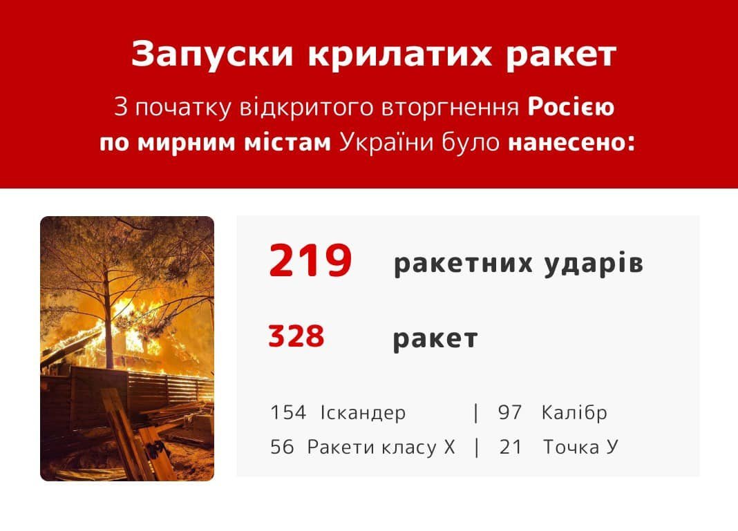 Від початку відкритого вторгнення Росія нанесла 219 ракетних ударів та випустила 328 оперативно-тактичних ракет наземного і морського базування типу «Іскандер» і «Калібр» по мирних містах і селах України.