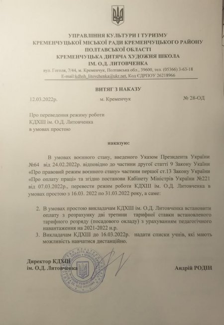 Педагоги художньої школи надіслали копію наказа директора - Андрія Родіна про те, що простій їм оплачуватимуть у розмірі 2/3 тарифної ставки з урахуванням навантаження. Наказ датований 12.03.22. Вони не отримували наказу про інший спосіб оплати (з розрахунку мінімалки, про який говорить керівник управління культури пан Кондрашов). Ситуація з оплатою дуже дивна: чи то керівник управління культури не знає, як відбувається насправді, чи то вводить в оману. Або директор художньої школи діє на власний розсуд.