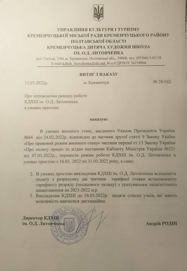 Педагоги художньої школи надіслали копію наказа директора – Андрія Родіна про те, що простій їм оплачуватимуть у розмірі 2/3 тарифної ставки з урахуванням навантаження. Наказ датований 12.03.22. Вони не отримували наказу про інший спосіб оплати (з розрахунку мінімалки, про який говорить керівник управління культури пан Кондрашов). Ситуація з оплатою дуже дивна: чи то керівник управління культури не знає, як відбувається насправді, чи то вводить в оману. Або директор художньої школи діє на власний розсуд.