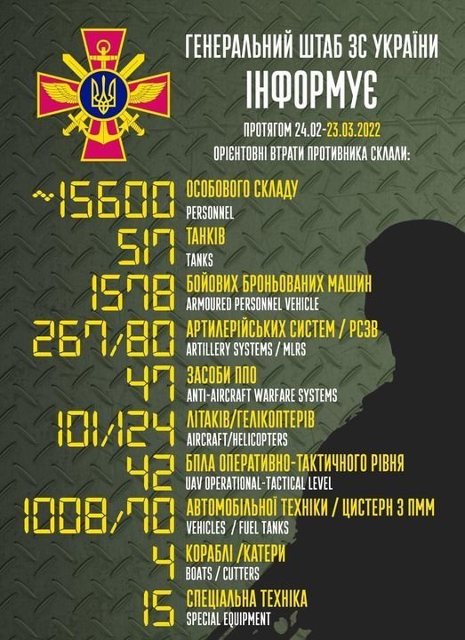 Загальні бойові втрати російських військ з 24.02 по 23.03 склали близько 15600 осіб.