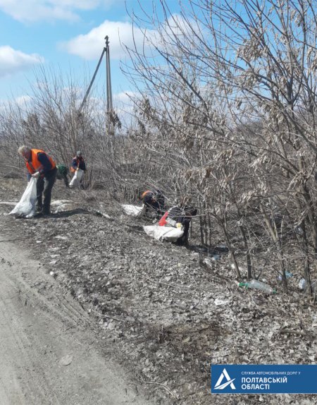 Служба автомобільних доріг Полтавщини почала прибирати узбіччя доріг, зупинки та блокпости області.