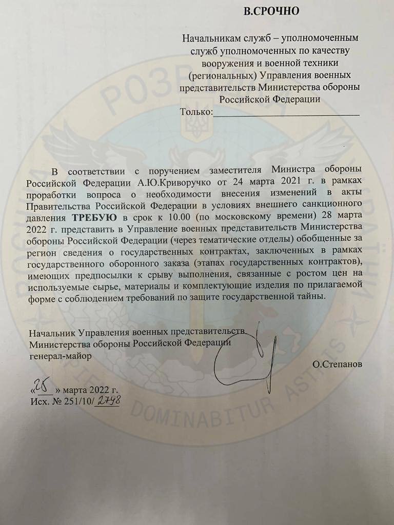 В РФ терміново збирають дані про державні контракти в рамках оборонного замовлення, які знаходяться на межі зриву через санкційний тиск. Як випливає з вимоги начальника управління військових представників міноборони рф, яка надійшла до оборонних підприємств держави окупанта, нездатність продовжувати виробництво пов’язана зі зростанням цін на сировину, матеріали і комплектуючі.