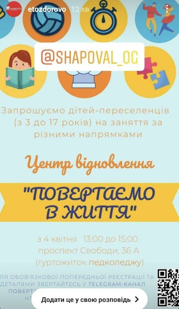 У Центрі відновлення «Повертаємо в життя» проводитимуть безкоштовні заняття для дітей за різними напрямками. Наповнюваність групи – до 12 осіб (для дітей від 3 до 17 років). Працює також група для батьків.