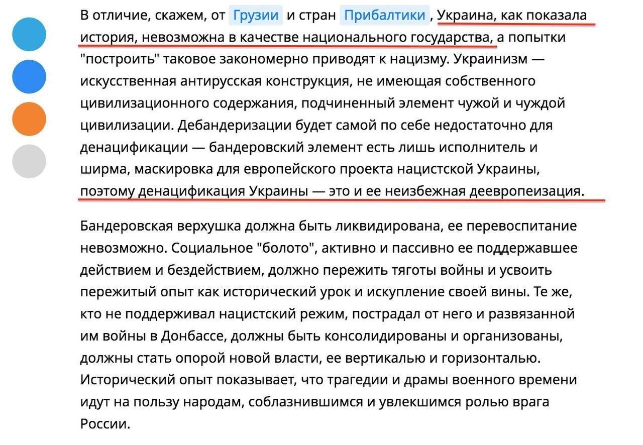 У редакції підкреслюють, що на відміну, від Грузії та країн Прибалтики Україна, як показала історія, неможлива як національна держава, а спроби «побудувати» українську державу нібито «закономірно призводять до нацизму». Автори заявляють, що «українізм це — штучна антиросійська конструкція, яка не має власного цивілізаційного змісту, підпорядкований елемент чужої та чуждої цивілізації».