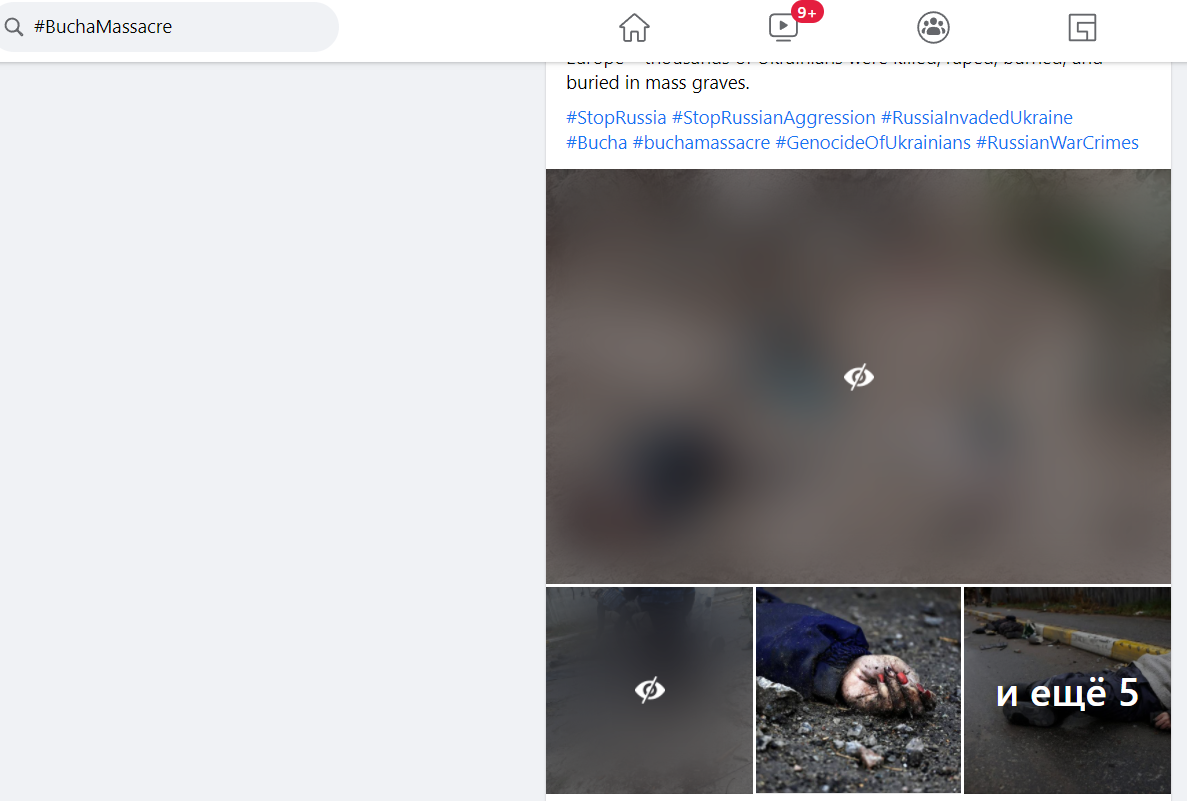 Нині ж за хештегом #BuchaMassacre Facebook і досі приховує частину фото.