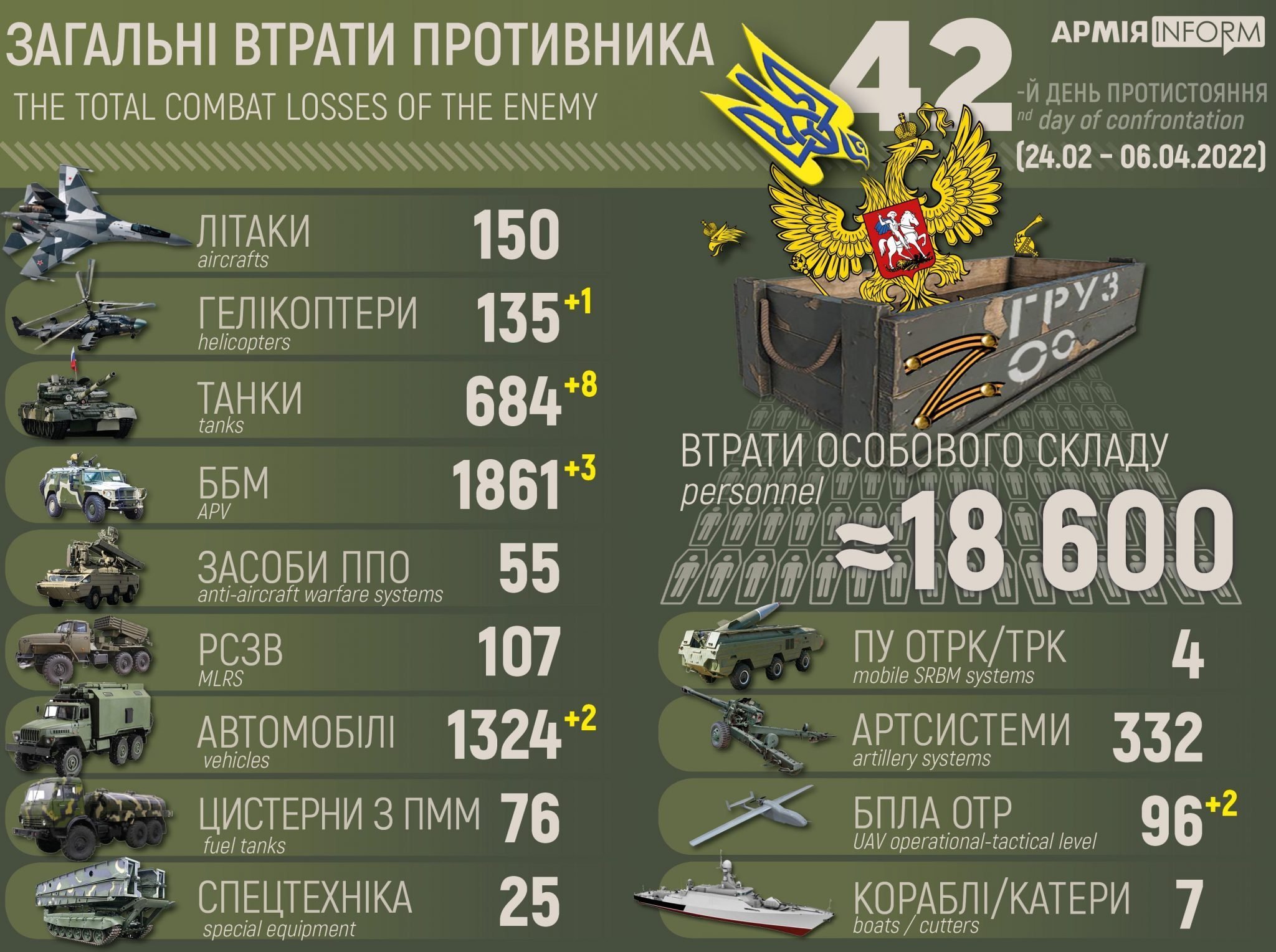 Генеральний штаб ЗС України повідомив про загальні бойові втрати ворога з 24 лютого по 6 квітня 2022 року. Орієнтовно вони склали: