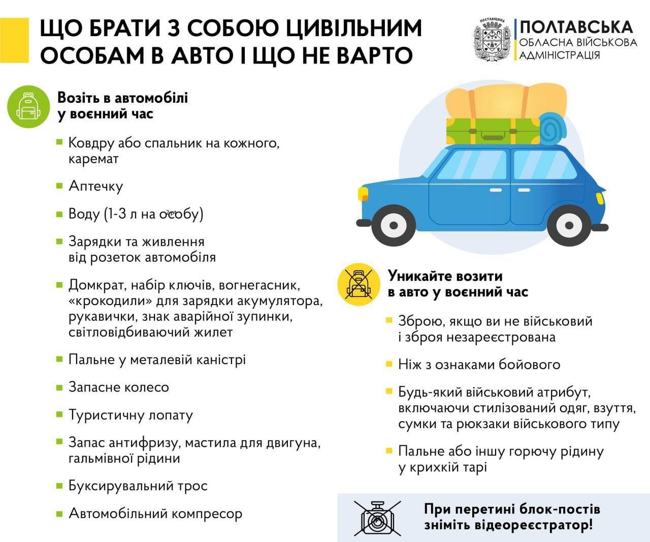 Начальник Полтавської обласної військової адміністрації Дмитро Лунін радить під час війни тримати свій автомобіль завжди має готовим на випадок екстреної евакуації. Він зауважує, що це може врятувати життя і радить, що найперше взяти з собою, а чого не варто брати.