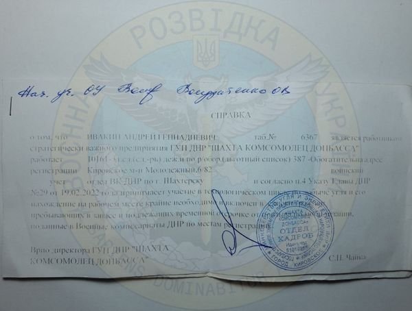 Документи осіб, що не підлягають призову, було знайдено серед паперів знищеного підрозділу так званої «армії ДНР». Зокрема, Олександра Савенка, інваліда дитинства, який не підлягав військовому призову. Або Андрія Івакіна, співробітнику шахти «Комсомолець Донбасу» із довідкою про те, що він працює на «стратегічно важливому підприємстві».