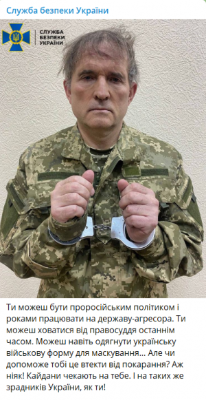«Ти можеш бути проросійським політиком і роками працювати на державу-агресора. Ти можеш ховатися від правосуддя останнім часом. Можеш навіть одягнути українську військову форму для маскування… Але чи допоможе тобі це втекти від покарання? Аж ніяк! Кайдани чекають на тебе. І на таких же зрадників України, як ти!
