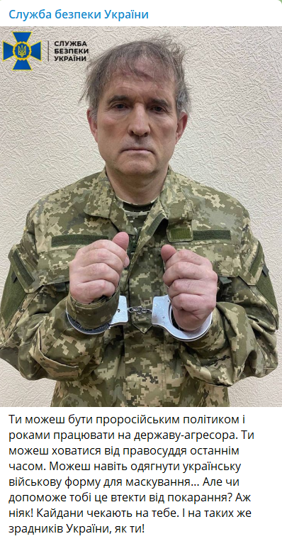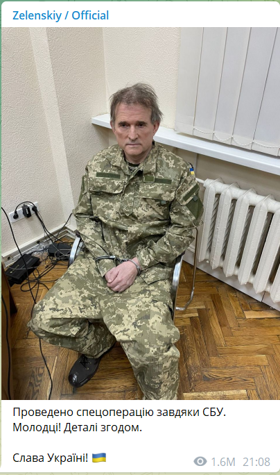 Президент України Володимир Зеленский на своєму офіційному телеграм-каналі повідомив про «проведену спецоперацію завдяки СБУ». Та опублікував фото оголошеного в розшук Віктора Медведчука. Деталі президент пообіцяв розповісти пізніше.