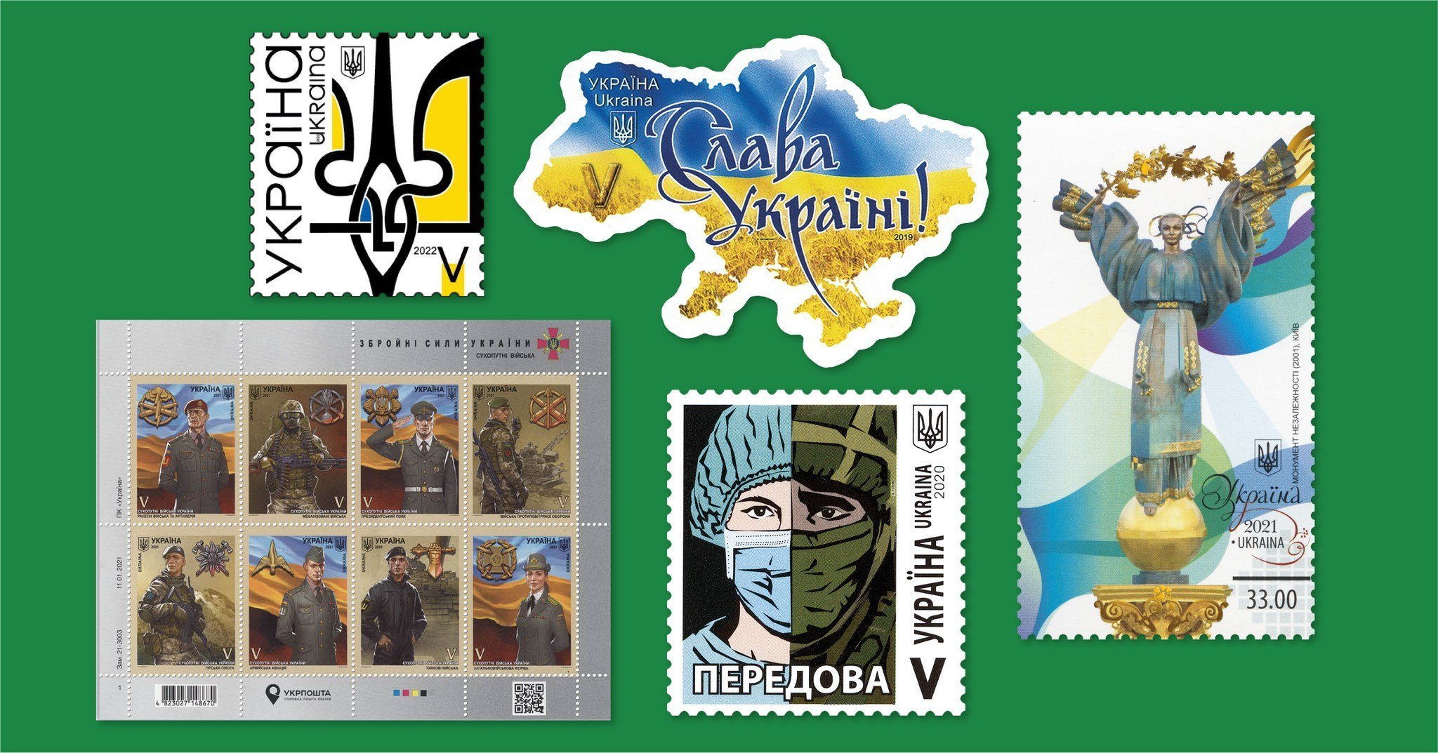 – Наприклад, V міститься на таких знакових поштових марках як «Монумент Незалежності (2001), Київ», «Передова», «Слава Україні!», «Збройні сили України. Сухопутні війська» і багато інших.