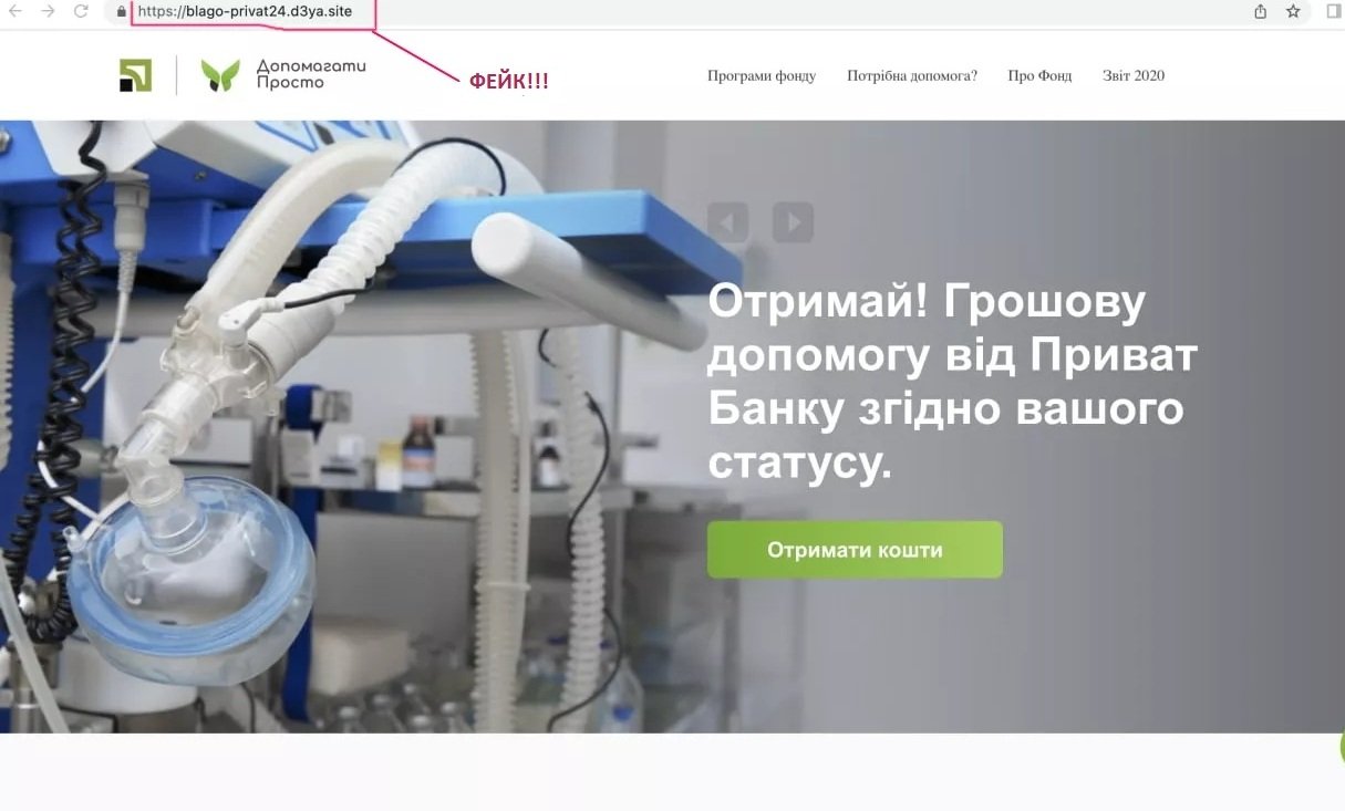 Шахраї створили сайт, що практично повністю дублює сторінку благодійної програми Привату «Допомагати просто!». Єдиною відмінністю від оригінального ресурсу є те, що на фейковому порталі замість пропозиції зробити пожертвування на ЗСУ чи переселенців клієнтам пропонують «отримати допомогу відповідно до статусу».