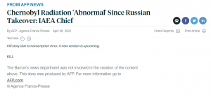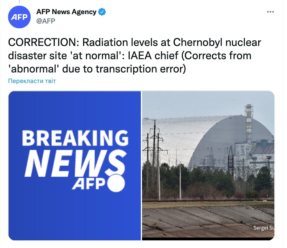 AFP News Agency виправило своє повідомлення з цитатою глави очільника Міжнародного агентства з атомної енергії Рафаель Ґроссі: журналісти переплутали слова «at normal» і «abnormal». Він сказав, що радіація у Чорнобилі «в нормі».