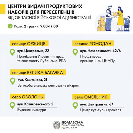 Нагадаємо, 28 квітня у трьох пунктах видачі гуманітарної допомоги вимушеним переселенцям у Кременчуці та Горішніх Плавнях почали видавати продуктові набори, які привезли з Полтавської ОВА. Видачу обіцяють продовжити, поки не забезпечать гуманітарною допомогою усіх вимушених переселенців. Раніше таку допомогу отримали переселенці, що проживають у Полтаві.