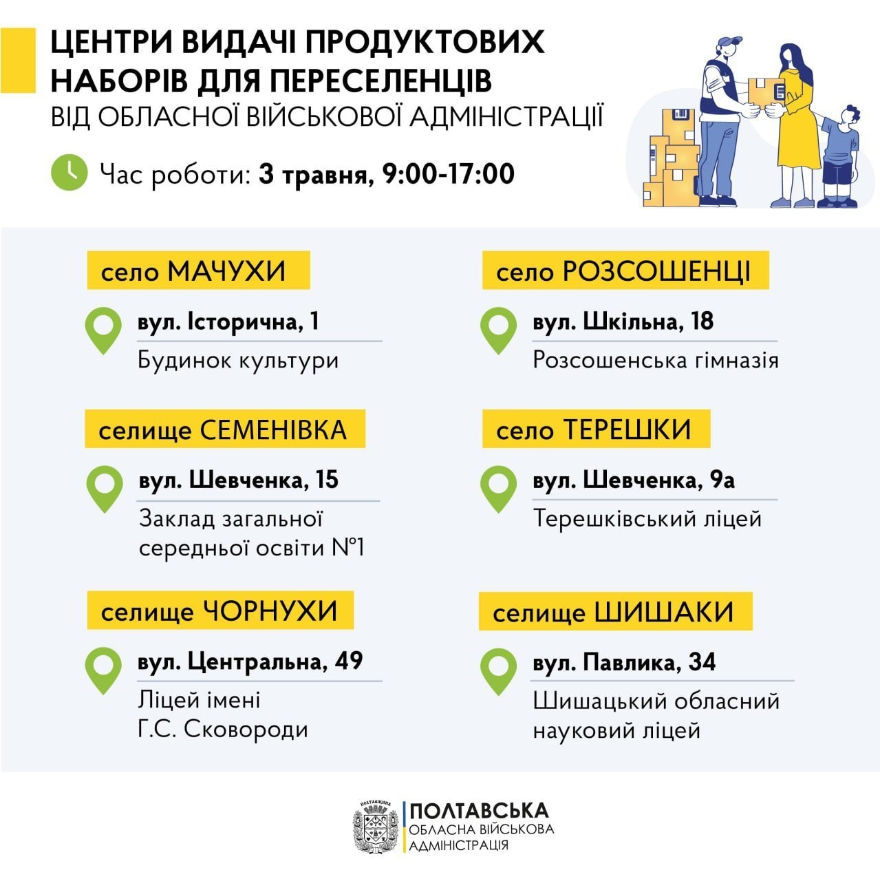 Завтра, 3 травня, Обласна військова адміністрація видаватиме продуктові набори для переселенців, які живуть у Терешківській, Мачухівській, Щербанівській, Чорнухинській, Семенівській, Шишацькій громадах, повідомив голова Полтавської ОВА Дмитро Лунін.