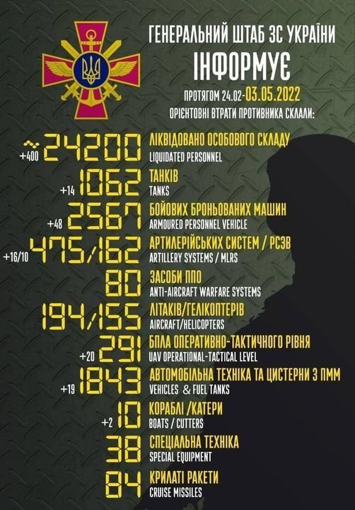 Загальні бойові втрати противника з 24.02 по 03.05 орієнтовно склали: