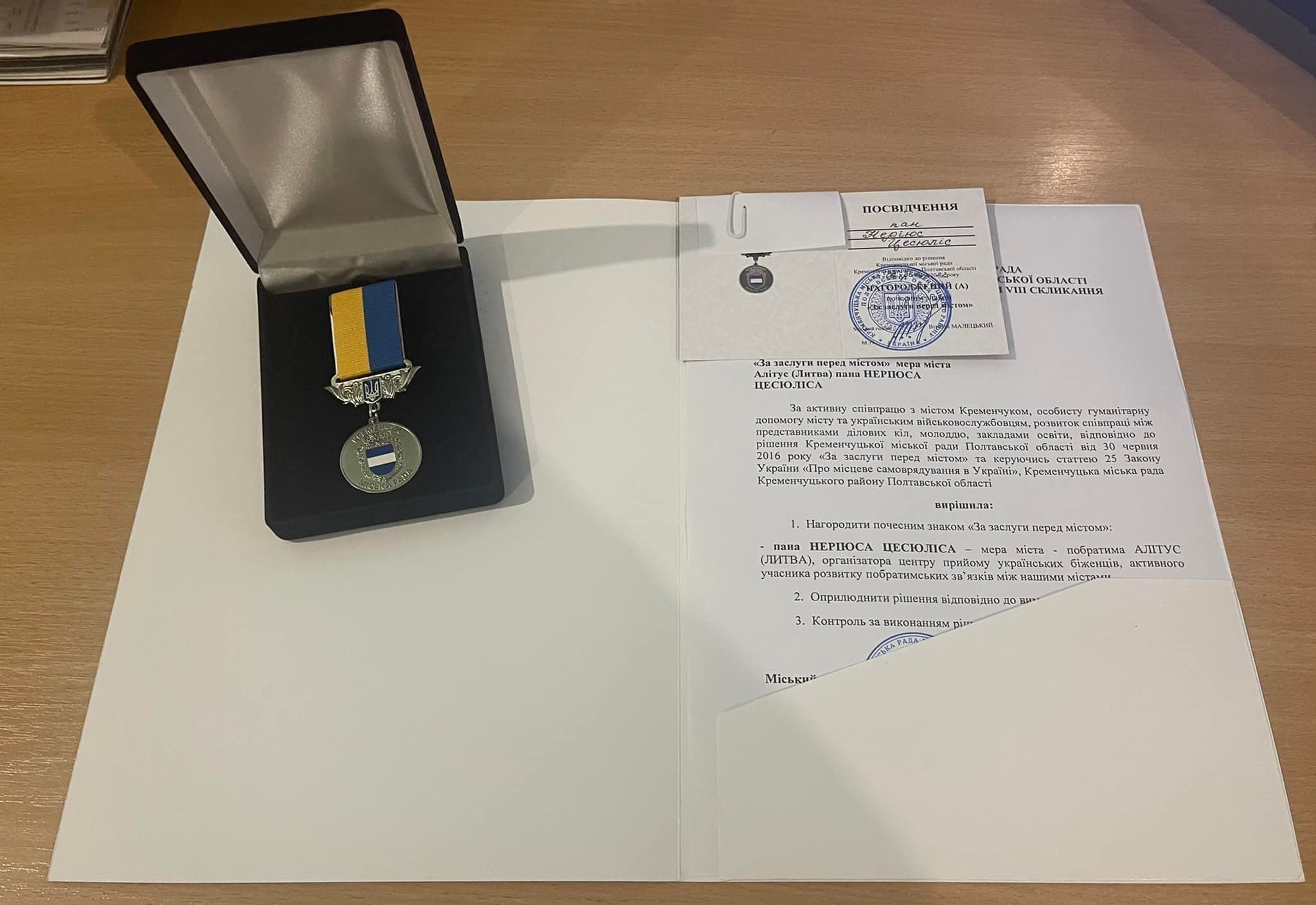 Кременчуцька міська рада ухвалила рішення про нагородження відзнакою «За заслуги перед містом» мера литовського міста Алітус Неріюса Цесюліса. Про це повідомив міський голова Віталій Малецький.