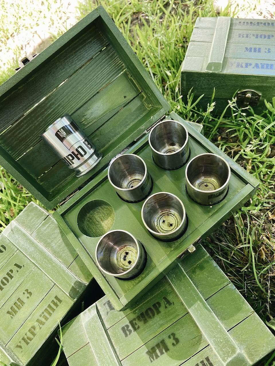 Чарки виконані з 6 бойових гільз калібру 14.5 (крупнокаліберний кулемет), використаних ЗСУ у війні проти російських окупантів.